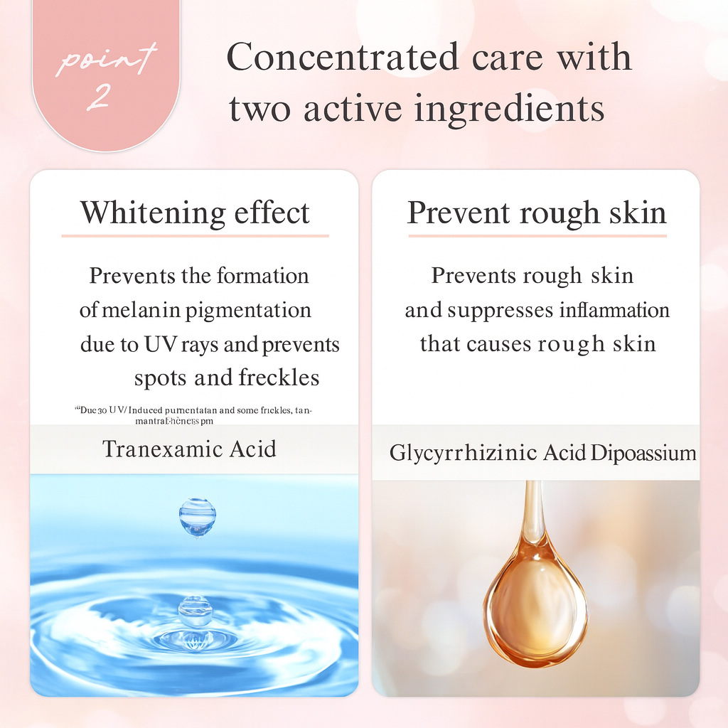 Ingredients: Tranexamic acid, dipotassium glycyrrhizinate, purified water, 1,3-butylene glycol, dark glycerin, sodium hyaluronic acid (2), ozon extract, laxophylbonoid, tysoex, chickoshi extract (1), peonoshita extract, sea fruit extract, dipropylene Glycol, Female Chylpolysiloxane, methylphenylpolysiloxane, cyclohexane dicarbonate, carboxyvinyl polymer, polyoxyethylene caster oil, polyoxyethylene, methylpolysiloxane copolymer and polyoxymethylpolycarbonate, poly(oxyethylene, oxypropylene methyloxane copolymer, d-cr-tocopherol, ethylene, ethylpolycarbonate, ethylpolycarbonate. Tanol, pillow Sodium Sulfite, Disodium Edethate, Potassium Hydroxide, Methyl Paraoxybenzoate, Phenoxyethanol, Fragrance