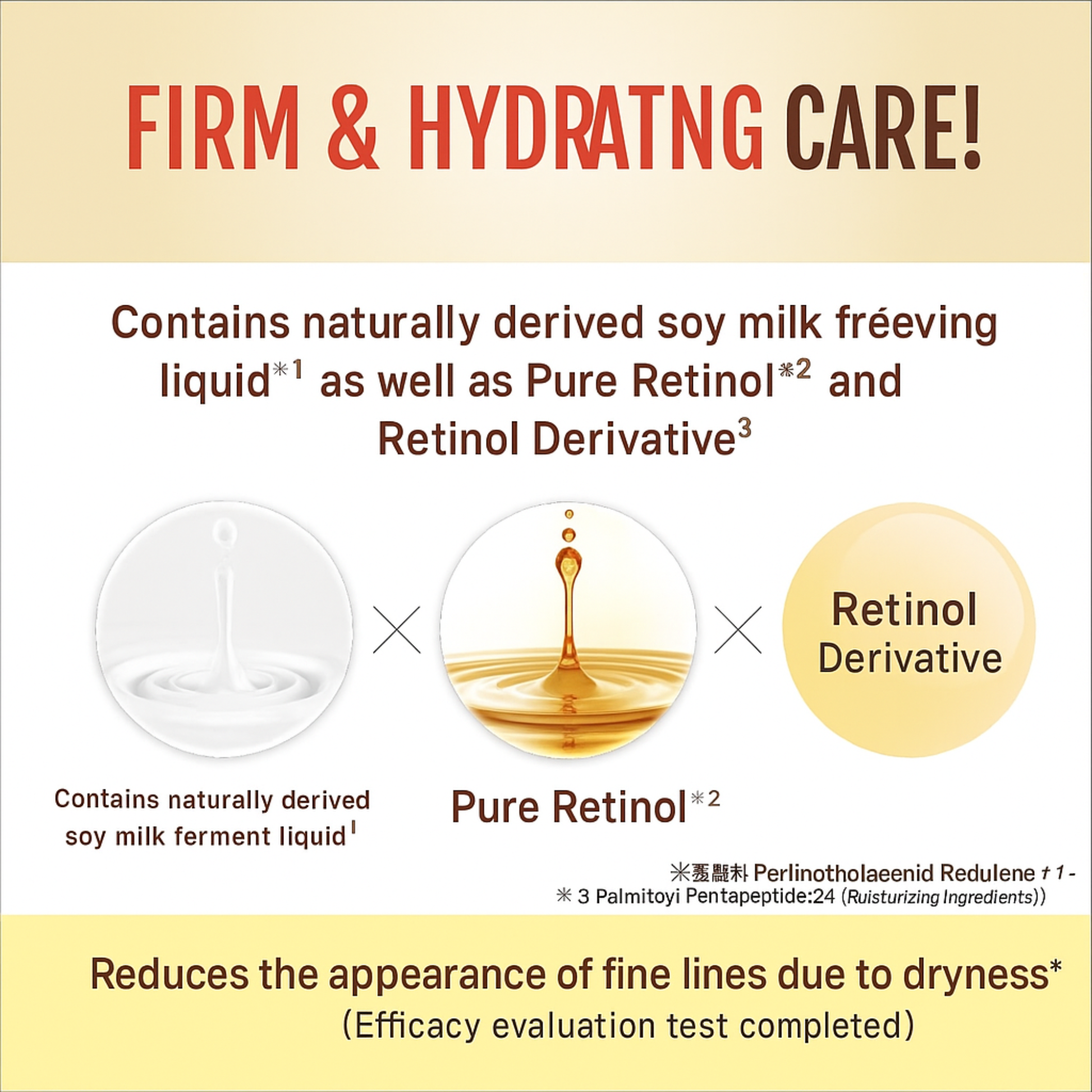 Day Gel Cream: Water, glycerin, butylene glycol, ethanol, cyclopentasiloxane, cetyl ethylhexanoate, hydrogenated castor oil stearate, soymilk fermentation liquid, soybean seed extract, soy protein, retinol, soy isoflavones, retinol palmitate, ceramide NG, vinyl dimethicone/methicone silsesquioxane crosspolymer, PEG-40 hydrogenated castor oil, PEG-60 hydrogenated castor oil, sodium ascorbate, arginine, carbomer, licorice root extract, dimethiconol, squalane, stearic acid, glyceryl stearate, sucrose stearate, sodium stearoyl glutamate, cetyl alcohol, soybean sterols, tocopherol, caprylic/capric triglyceride, sodium polyacrylate, polysorbate 80, lecithin, potassium hydroxide, hydrogenated lecithin, phenoxyethanol