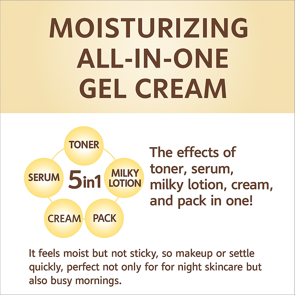 - الخاصية: كريم جل 5 في 1 مرطّب – سيروم – كريم – ماسك – ومرطّب نهاري، لمقاومة التجاعيد وعلامات الشيخوخة وترطيب البشرة بشكل عميق ولطيف