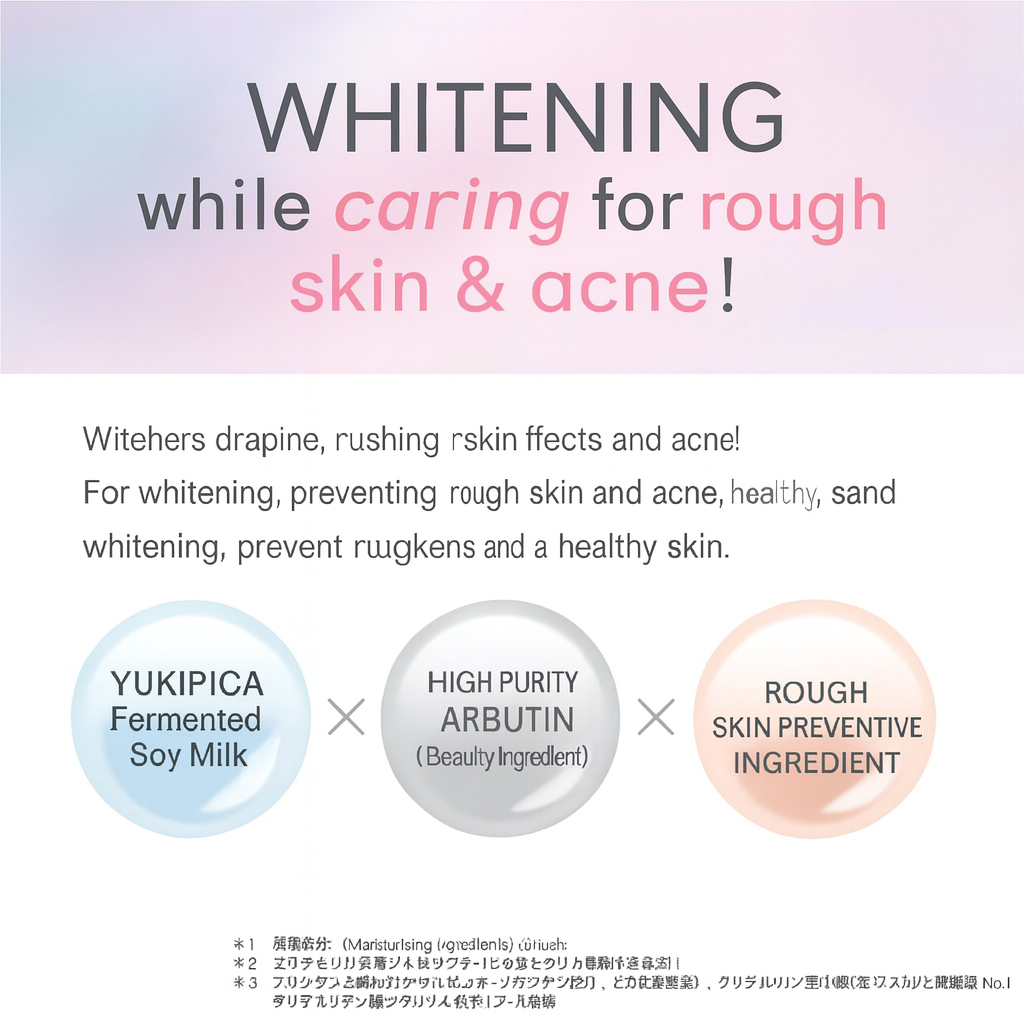 Arbutin*, Dipotassium Glycyrrhizate*, Water, DPG, Concentrated Glycerin, Cetyl 2-Ethylhexanoate, 1,2-Pentanediol, Fermented Soymilk, Soybean Extract, Butylene Glycol, Acrylic Acid/Alkyl Methacrylate Copolymer, Alcohol, Glycerin Mono 2-Ethylhexyl Ether, Pentasodium Diethylenetriaminepentaacetate, Sodium Stearoyl Glutamate, Glyceryl Tri-2-Ethylhexanoate, Sodium Metabisulfite, Behenyl Alcohol, Polyethylene Glycol/Decyltetradeceth-20/Hexamethylene Diisocyanate Copolymer, Polyoxyethylene Hydrogenated Castor Oil, Methylphenylpolysiloxane, Magnesium Ascorbyl Phosphate, Sodium Hydroxide, Natural Vitamin E, Phenoxyethanol *Ingredients marked are active ingredients. *Ingredients without an * are other ingredients.