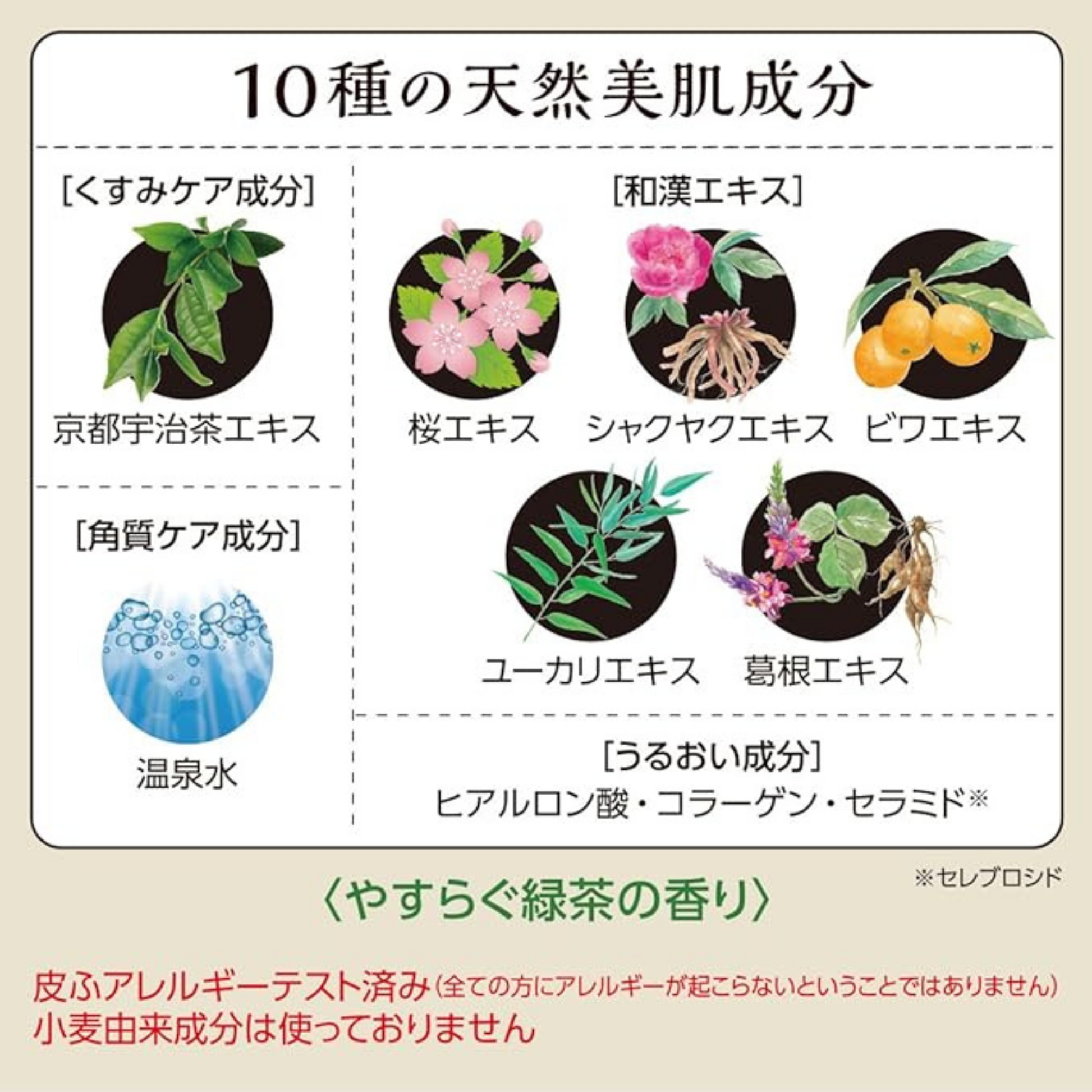 Soap base, potassium-containing soap base, water, sodium oleate, palm fatty acid, palm kernel fatty acid, glycerin, cocamidopropyl betaine, tea leaf extract, sodium hyaluronate, hydrolyzed collagen, jojoba seed oil, althea root extract, squalane, hydrolyzed conchiolin protein (Pearl Extract), sphingomyelin (milk),milk fat (milk), lactose (milk), sodium chloride, methyl gluceth-20, polyquaternium-7, cellulose gum, fragrance, BG, methicone, gunjo, iron oxide, tetrasodium etidronate, tetrasodium EDTA, methylparabe