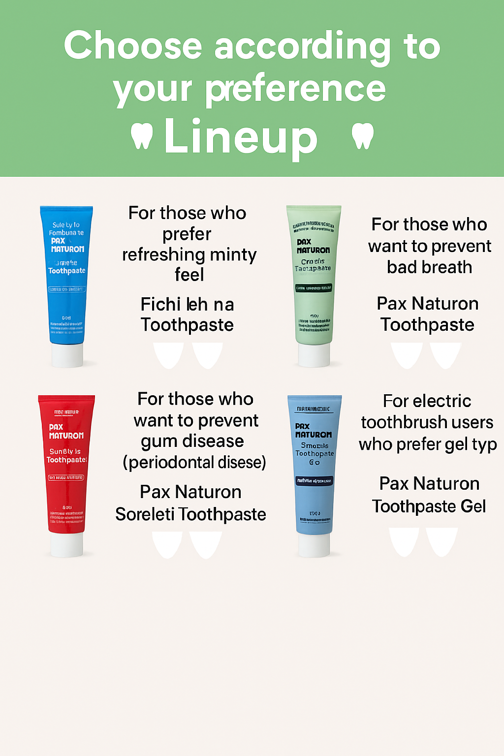 - الأخضر: بخلاصات عشبية بالكامل لتنظيف لطيف، تبييض الأسنان، إزالة النفس الكريه، مقاومة التسوس وإزالة الجير – بدون رائحة منعشة قوية.