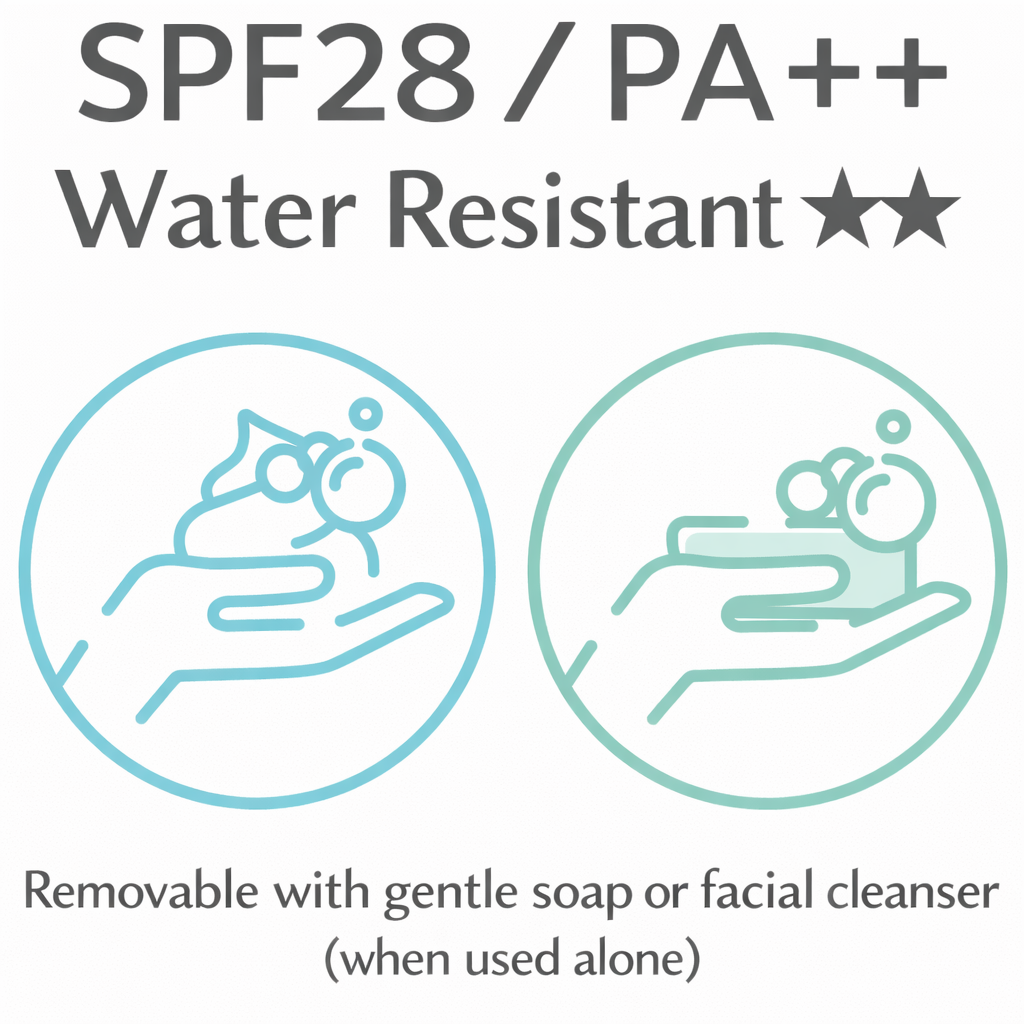 التركيبة مقاومة للماء والعرق، وخالية من العطور والزيوت المعدنية ومن دون UV Absorbers لتكون مناسبة للبشرة الحساسة وللاستخدام اليومي.