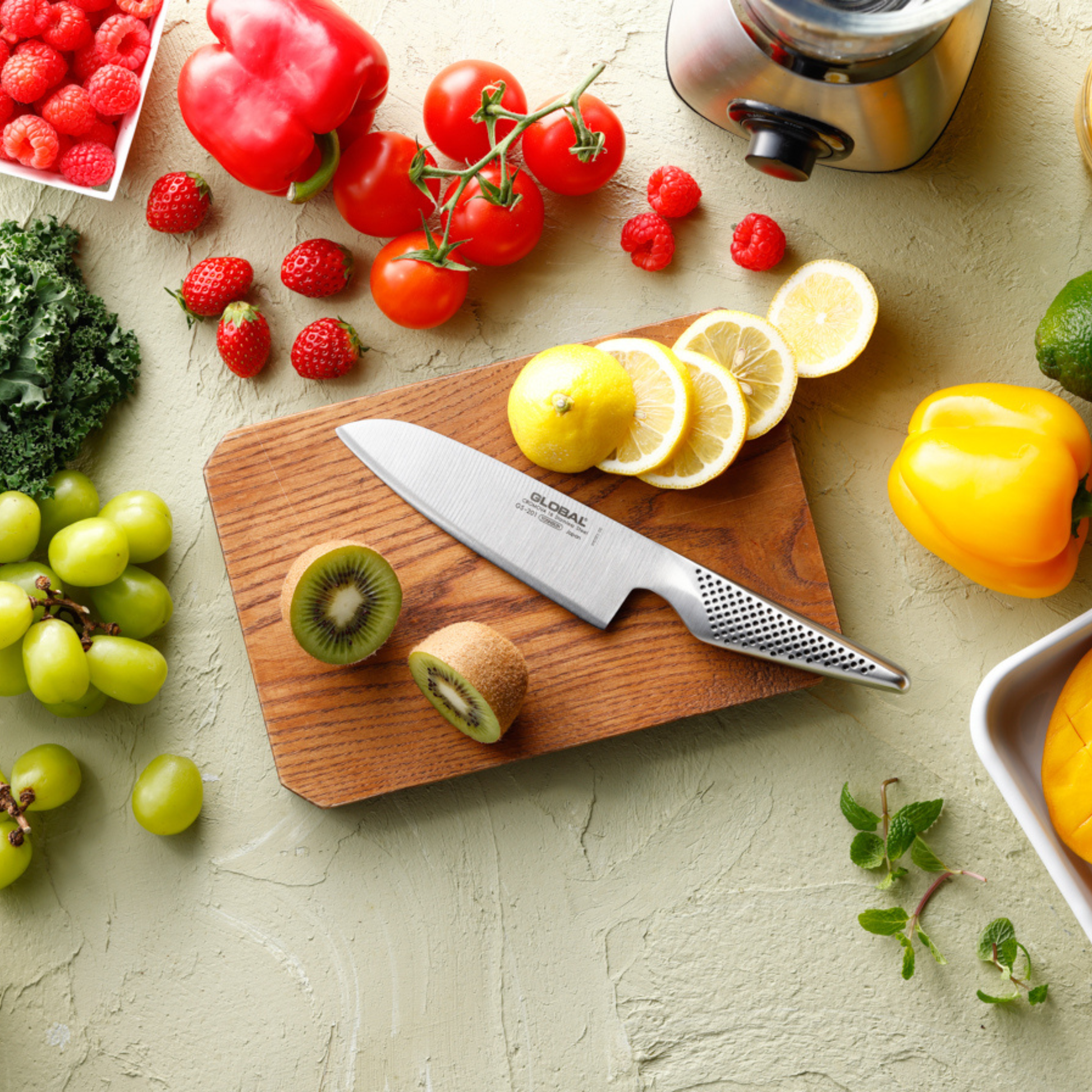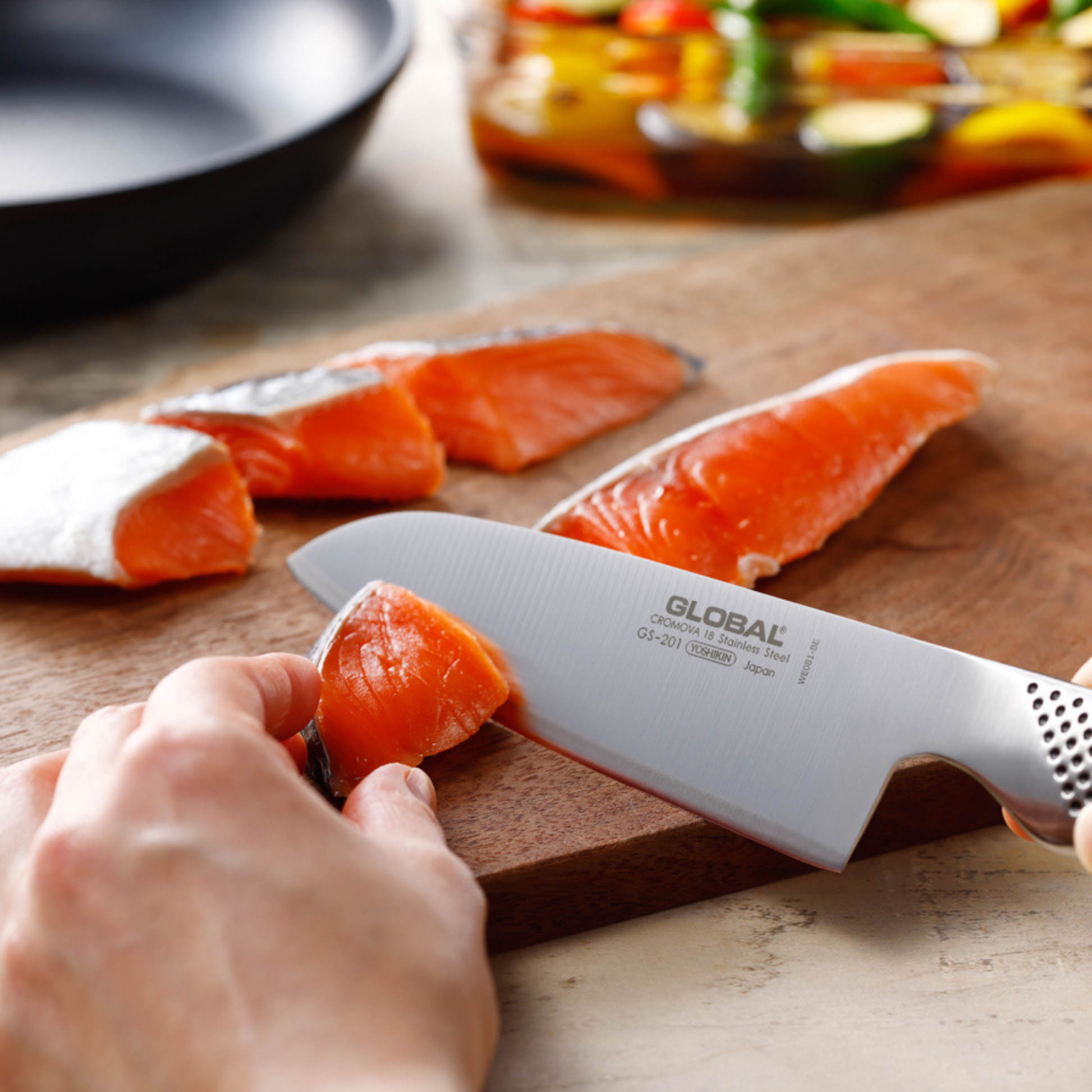 تقدّم علامة Global اليابانية سكاكين التقطيع المصغّر GS-202 & GS-200 وسكين السانتوكو الصغير GS-201 بتصميم احترافي يجمع بين الأناقة والدقة. سكين متعدد الاستخدامات مثالي لتقطيع وفرم اللحوم، الأسماك، والخضروات، مع أداء استثنائي بفضل حدة شفرته المصنوعة من الفولاذ المقاوم للصدأ بالكامل.