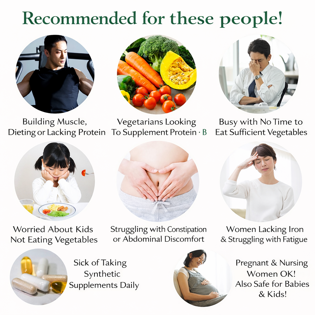 - الفئة المستهدفة: الرياضيون وأصحاب الحمية الذين يحتاجون دعم البروتين، النباتيون الذين يعانون من نقص البروتين أو فيتامين B12، الأشخاص أصحاب نمط الحياة السريع الذين لا يحصلون على كمية كافية من الخضار، من يعانون من إرهاق، سوء تغذية أو ضعف في النشاط اليومي، الأطفال الذين لا يحبون الخضار (نقص في التغذية)، النساء اللواتي يعانين من نقص الحديد، النساء الحوامل والمرضعات (آمن عند الاستخدام الصحيح)، كبار السن، من يعانون من مشاكل الإمساك ويريدون تحسين صحة الأمعاء