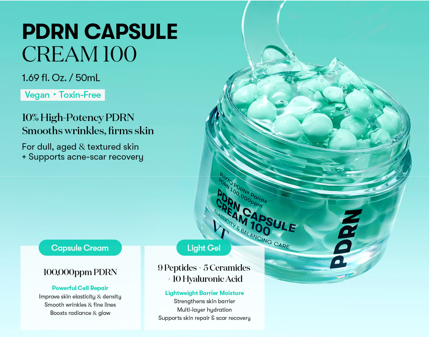 VT COSMETICS PDRN Capsule Cream هو كريم علاجي متطوّر يجمع بين كبسولات PDRN عالية التركيز وجل مرطّب خفيف القوام، ليمنح البشرة ترطيبًا عميقًا، مرونة محسّنة، ومظهرًا صحيًا مشرقًا بتأثير Glass Skin من أول استخدام ومع الاستمرار.