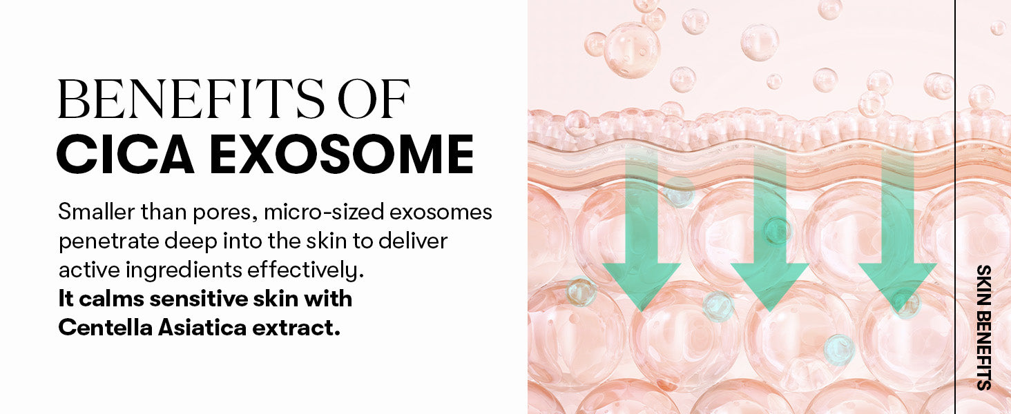 تم تعزيز التركيبة بمكوّنات CICA Exosome ذات الحجم المجهري الأصغر من المسام، ما يسمح لها بالتغلغل العميق داخل الجلد لتقديم: